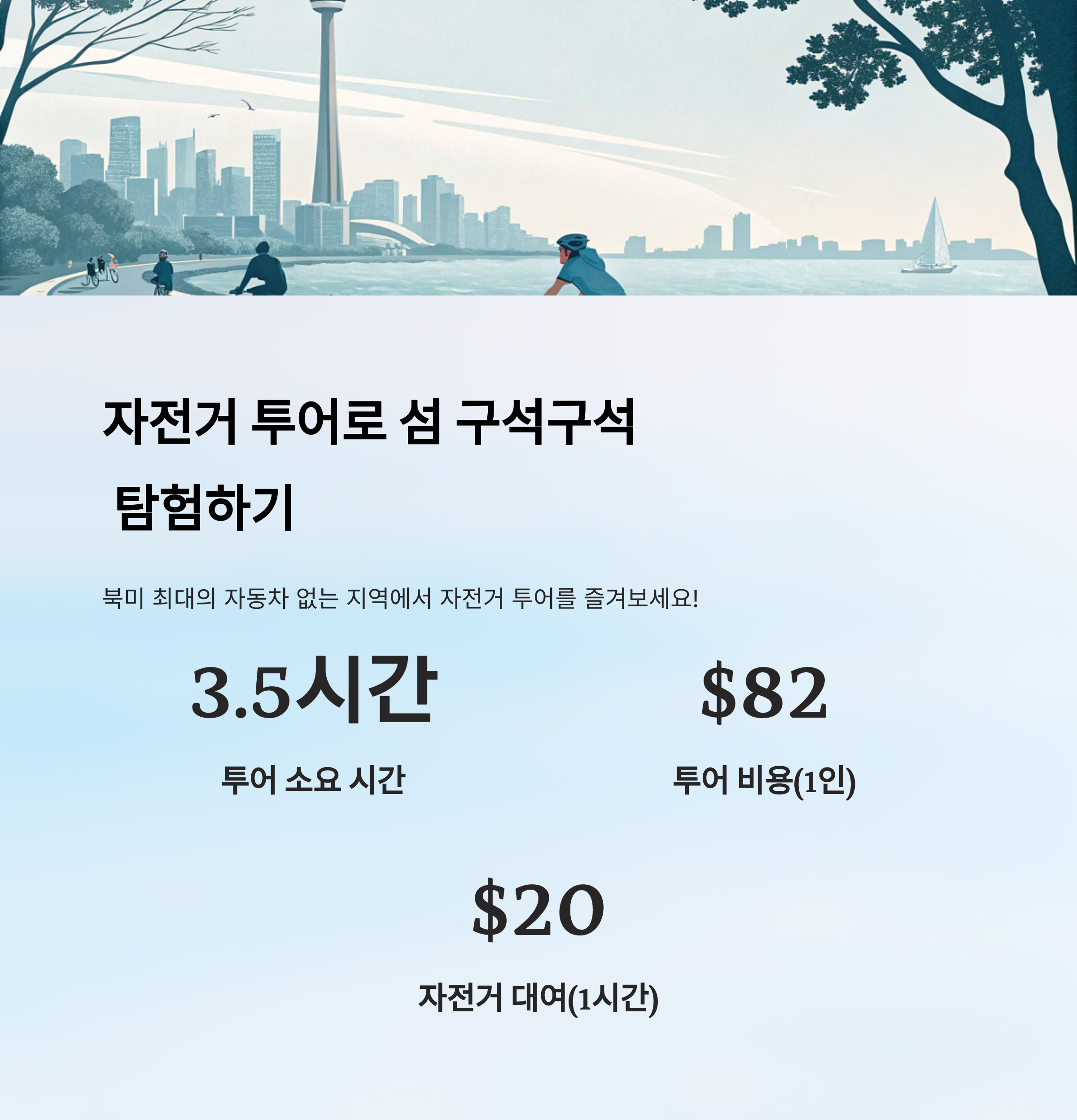 자전거 투어는 토론토 아일랜드의 또 다른 매력입니다. 정비가 잘 된 자전거 도로 위에서 센터 아일랜드와 지브롤터 포인트 등을 둘러보며 섬 전체를 여유롭게 감상할 수 있습니다. 투어는 약 3.5시간 동안 진행되며, 자전거, 헬멧, 간식, 페리 왕복 티켓이 포함된 알찬 구성입니다. 영어와 프랑스어 가이드를 통해 해설도 제공되어 외국인 관광객에게도 인기가 높으며, 특히 저녁 시간대의 트와일라잇 투어는 섬의 야경과 도심의 스카이라인을 감상하기에 제격입니다.